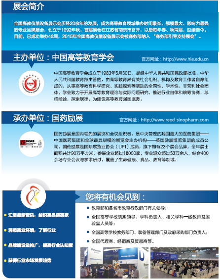 全國高教儀器設(shè)備展示會歷經(jīng)20余年的發(fā)展,成為高等教育領(lǐng)域舉辦時間最長、規(guī)模最大、影響力最強(qiáng)的專業(yè)品牌展會,創(chuàng)立于1992年秋,已成功舉辦48屆,2015年全國高教儀器設(shè)備展示會被商務(wù)部納入 “商務(wù)部引導(dǎo)支持展會”。